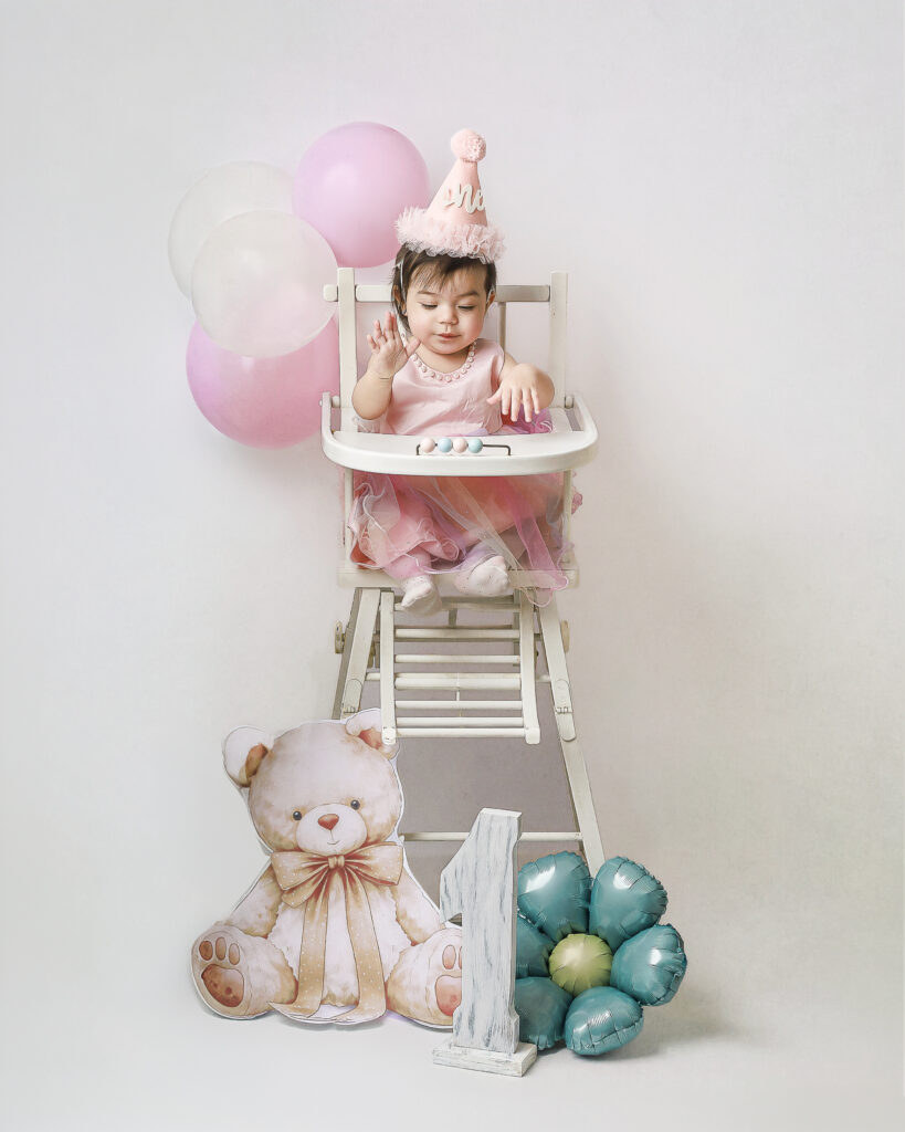 La decoración se define previamente con un estilo delicado e infantil. Puede incluir globos, una figura o motivo decorativo y la torta de la sesión. Dependiendo de las necesidades del bebé, la torta puede ser real o decorativa, para cuidar siempre su bienestar durante la experiencia.