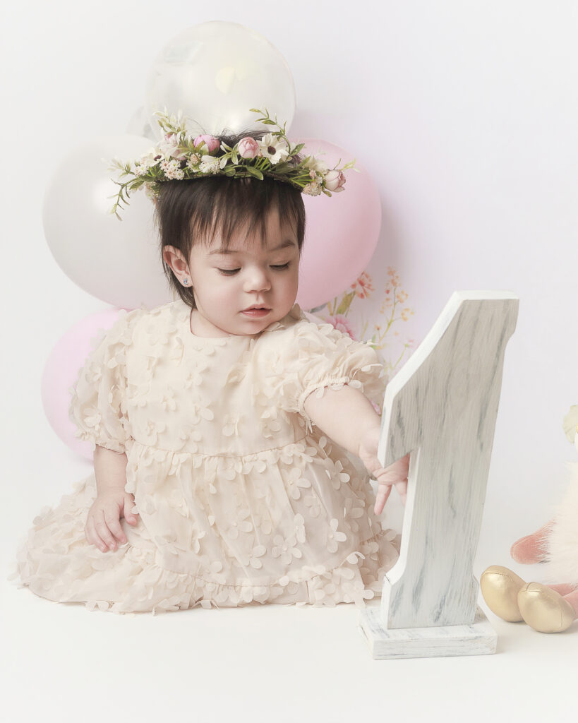 Es una sesión especial para celebrar el primer cumpleaños del bebé en estudio, en un entorno cuidado y tranquilo. El bebé interactúa libremente con su pastel mientras se crean imágenes naturales, elegantes y atemporales.